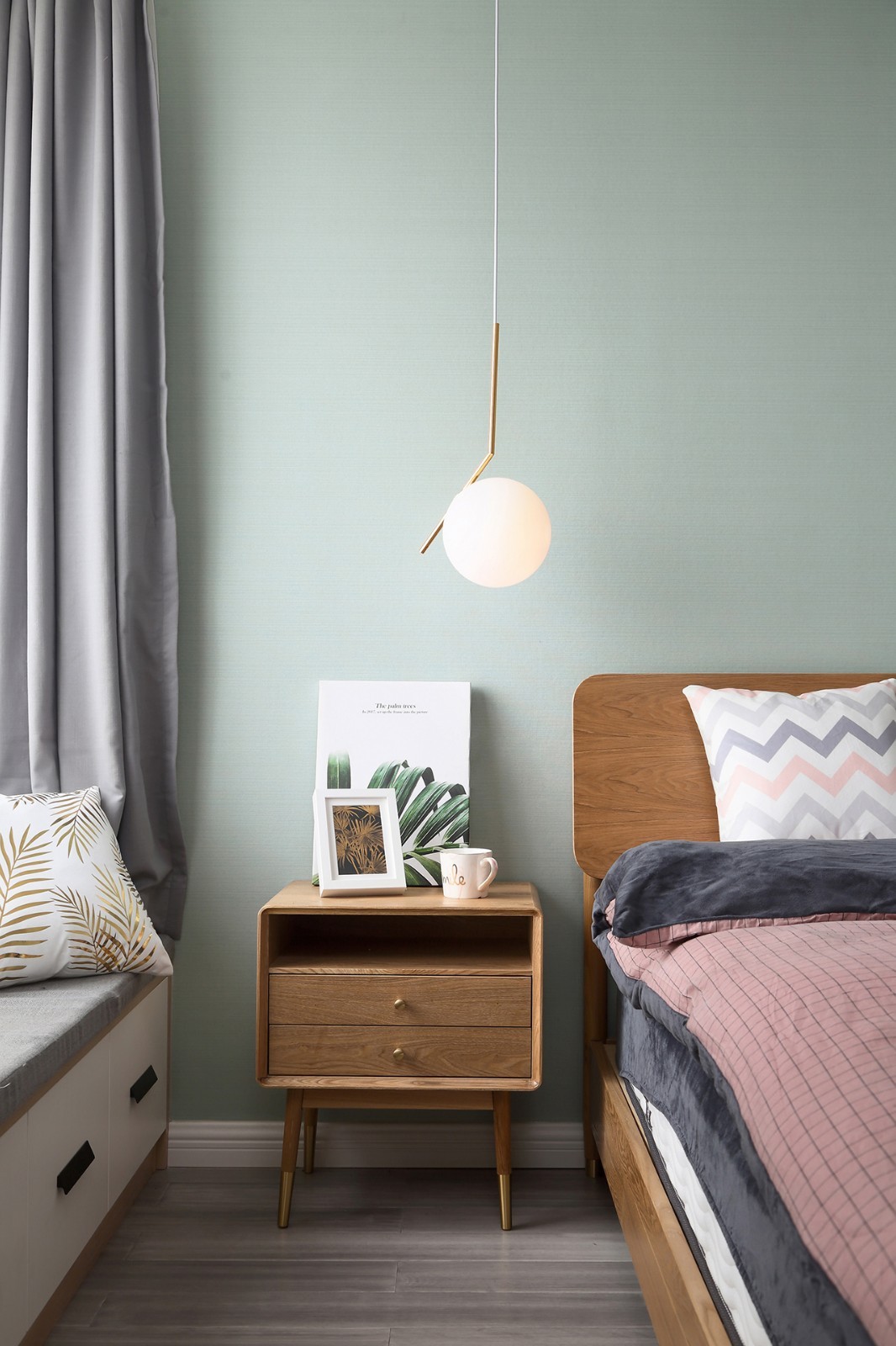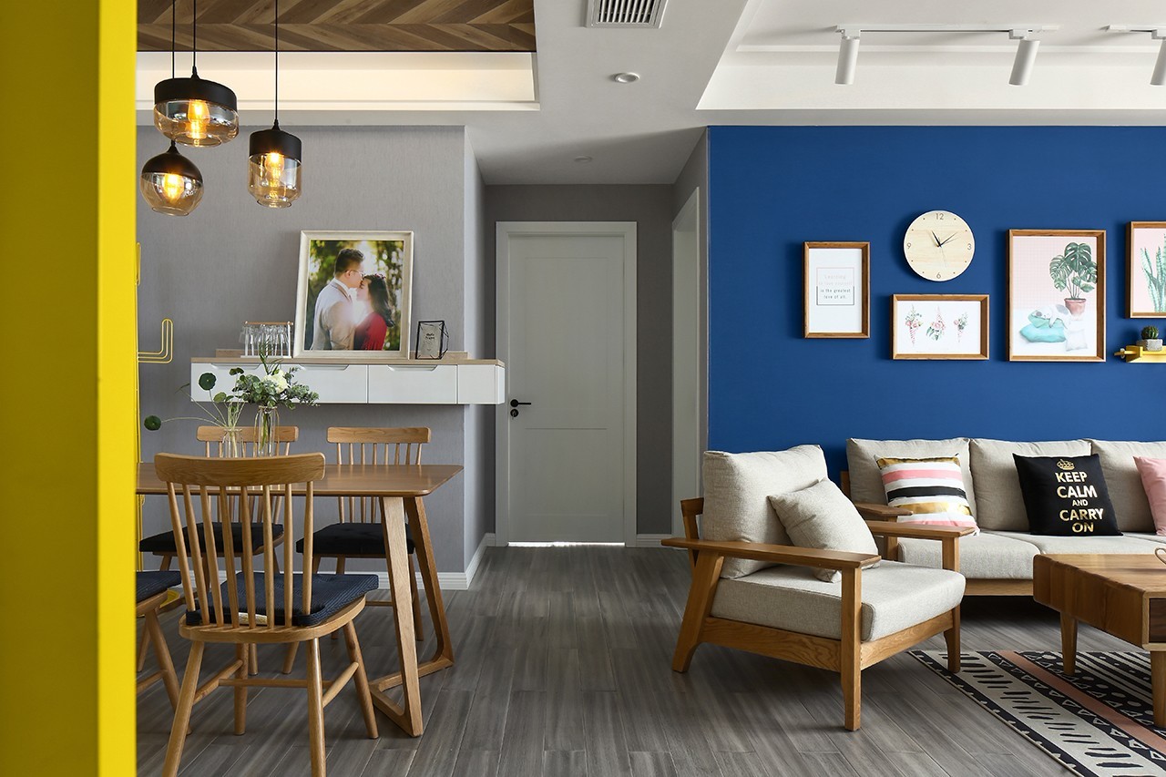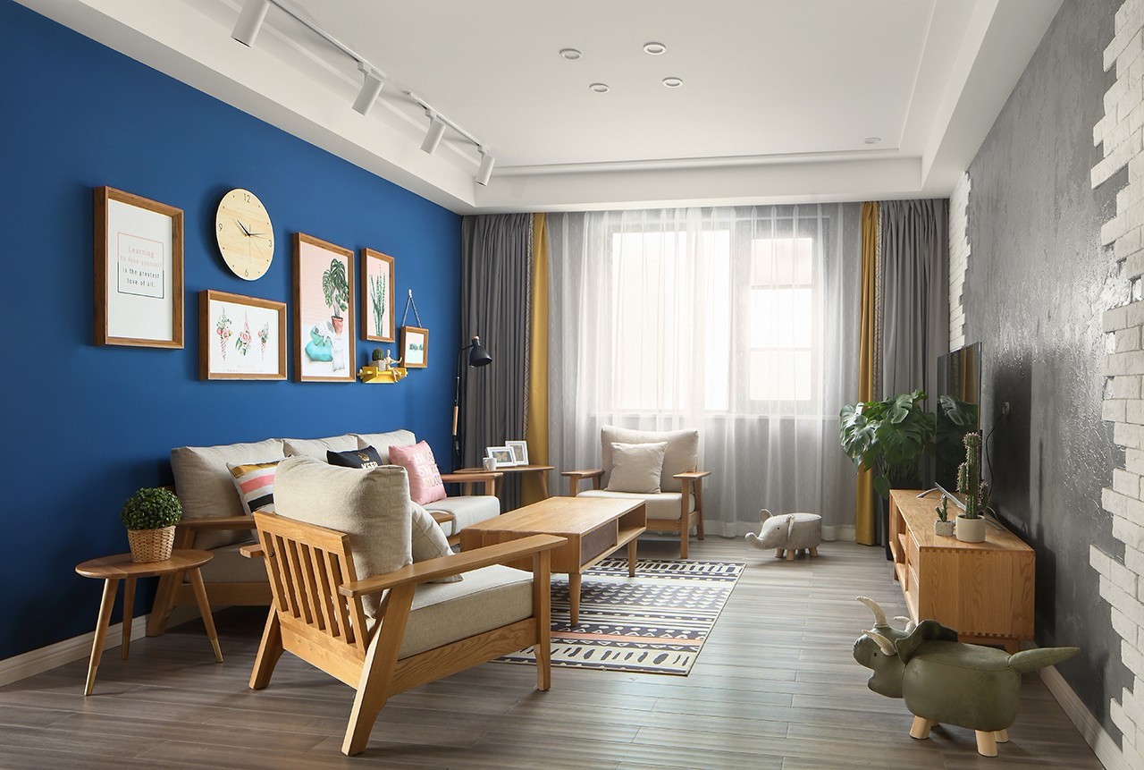 原木色布藝沙發撞色深藍色墻布的背景,突出木作家居給予空間的原生態環境