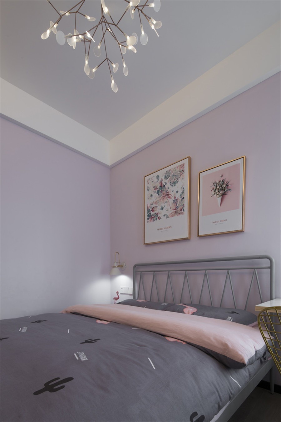 不同于主臥的素雅,少女心滿滿的女兒房, 床頭掛畫(huà),鐵藝床與火烈鳥(niǎo)床單,INS風(fēng)十足。