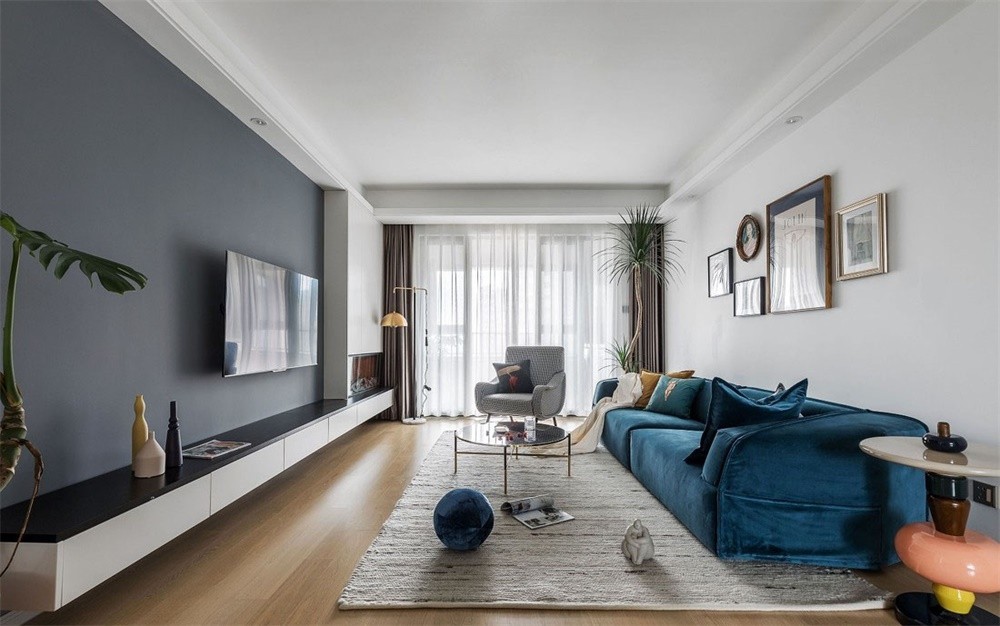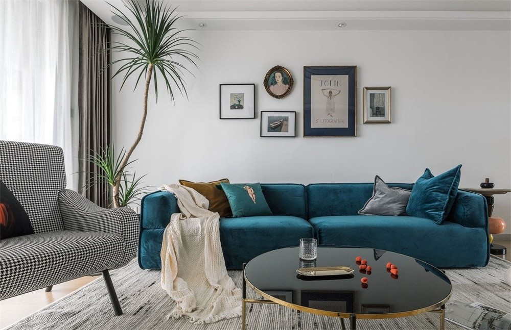 絲絨質(zhì)感的沙發(fā)搭配金屬角的玻璃茶幾,造型別致的糖葫蘆角幾、有趣的抱枕圖案、集實(shí)用與美觀于一體的電視柜有了壁爐的襯托讓客廳空間加分,營(yíng)造出一個(gè)愜意輕松的生活氛圍,既混搭又精致。