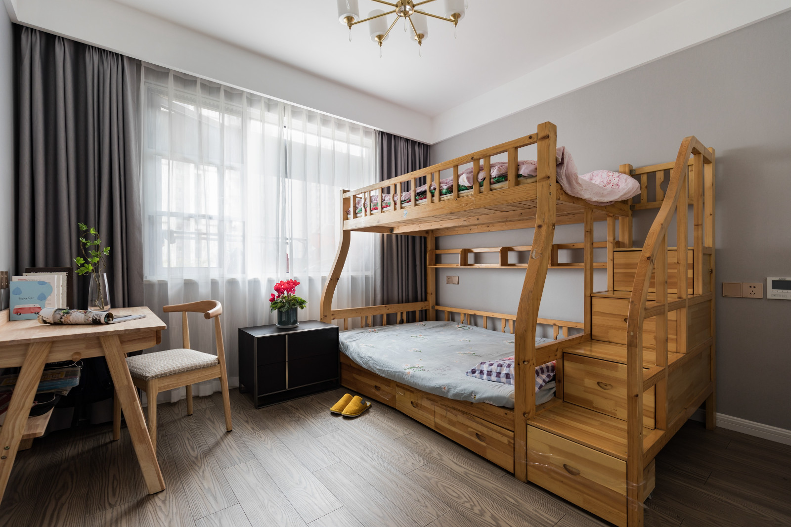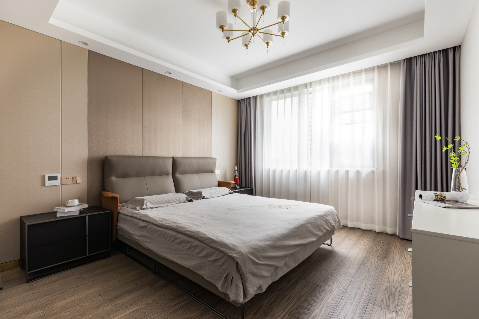 主臥整體灰調,淺色灰背景墻,搭配深灰色皮質床靠背,棕色木紋家具經典。