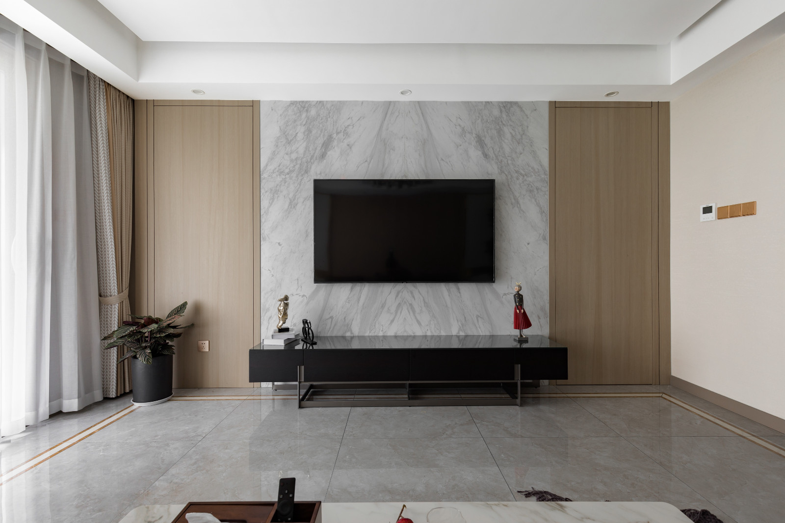 客廳戶型方正,整面木飾面板裝飾沙發背景墻,原木家具搭配米色布藝沙發,文藝淡雅。