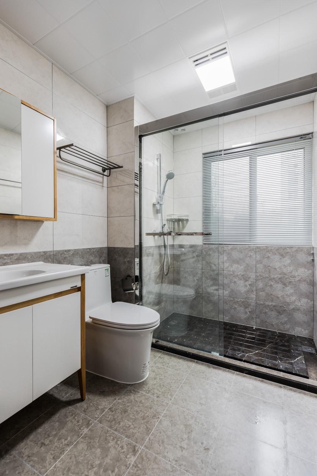 衛生間簡約黑白灰掉,白色+灰色墻面腰線設計,深色簡約臺盆柜加深了空間層次感。
